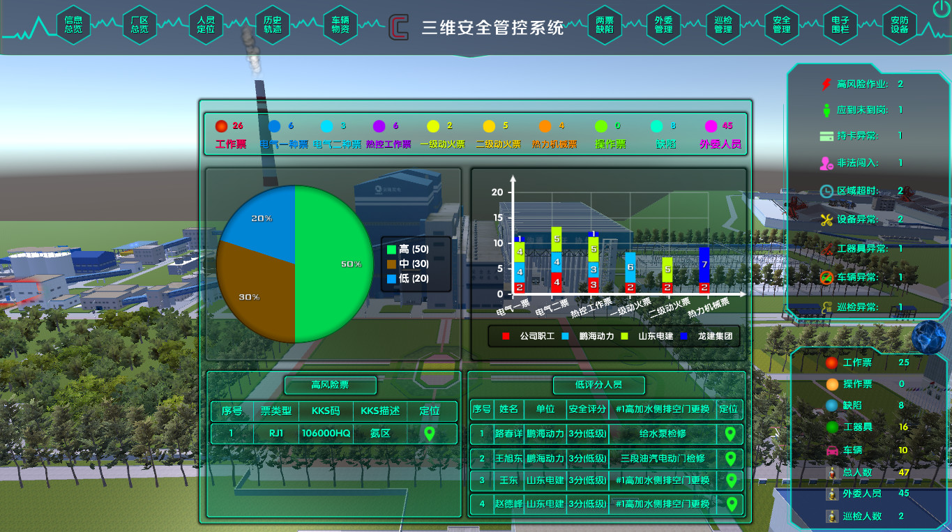 系統把整個廠區劃分為N個作業區域,根據作業區域安全風險的高低做出相應的等級劃分,便于重點區域重點監控。根據各人員的工作崗位和工作內容進行區域授權,對人員闖入未授權區域系統立即報警。同時系統會接入ERP中的兩票、缺陷信息,根據兩票、缺陷信息中的區域位置及設備的KKS編碼,把兩票、缺陷作業劃分到相應的區域中,實現兩票、缺陷及作業人員分區域列表展現和三維展現,方便查看與管理。